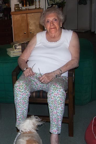 Ann in her chair with a dog nearby