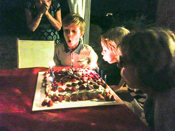 Look at this cake Monica made. Theo and I blow out the candles with assistance from Azure.