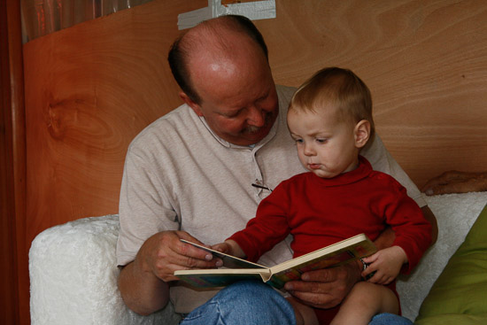 Steve reads a book to Azure.